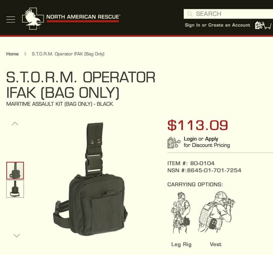 Cercando in rete “usmc ifak storm” si trovano diverse occasioni di acquisto di tale prodotto, con fotografie che lo mostra avere le medesime caratteristiche di quello qui proposto. Anche ricercando il numero NSN 8645-01-701-7254 della pouch North American Rescue non si arriva a molto di più, scoprendo semplicemente (iso-group.com) che fa riferimento alla sacca per il trasporto dell’equipaggiamento individuale.