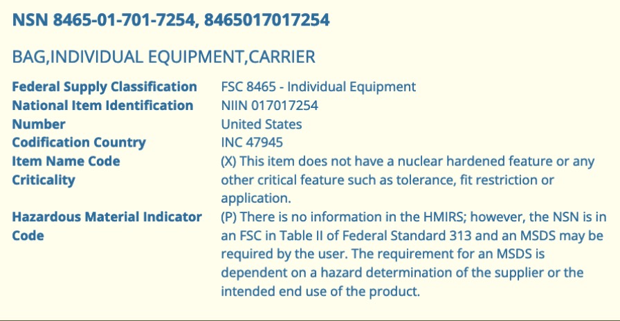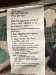 La giberna mi è stata venduta come IFAK del Corpo dei Marine US. Appena l’ho esaminata la prima cosa che mi ha lasciato perplesso è stata l’assenza delle tipiche etichette che identificano le forniture per il Dipartimento della Difesa da cui US Army, USMC, ecc.. dipendono, come ad esempio quella nell’immagine sottostante.