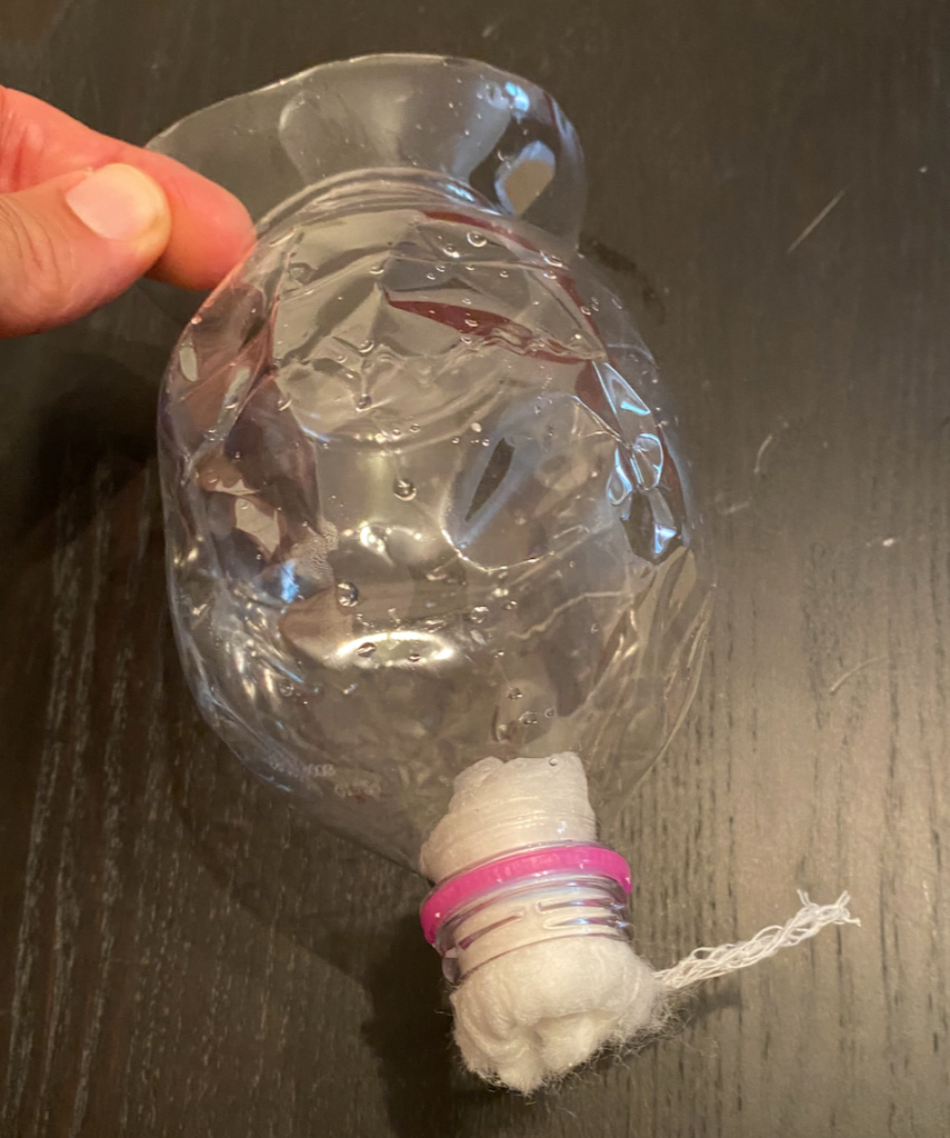 E’ necessario prestare attenzione al fatto che l’assorbente interno, per quanto allargato, non è sufficientemente “corposo” per ostruire l’imboccatura della bottiglia, lascierebbe quindi trafilare l’acqua sporca dalle fessure che si creerebbero tra il cotono e la bottiglia. E’ dunque necessario avvolgerlo su se stesso ed inserirlo a forza nell’imboccatura/collo della bottiglia in modo da ostruirlo. Così facendo l’acqua non trafilerà, ma filtrerà attraverso il cotone del tampone lasciando le particelle in sospensione, lo sporco, al di sopra di esso.