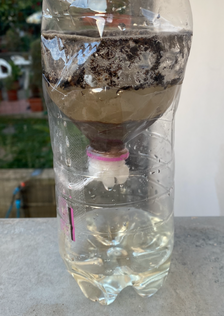 - rovesciare nella bottiglia di palstica capovolta l’acqua sporca.